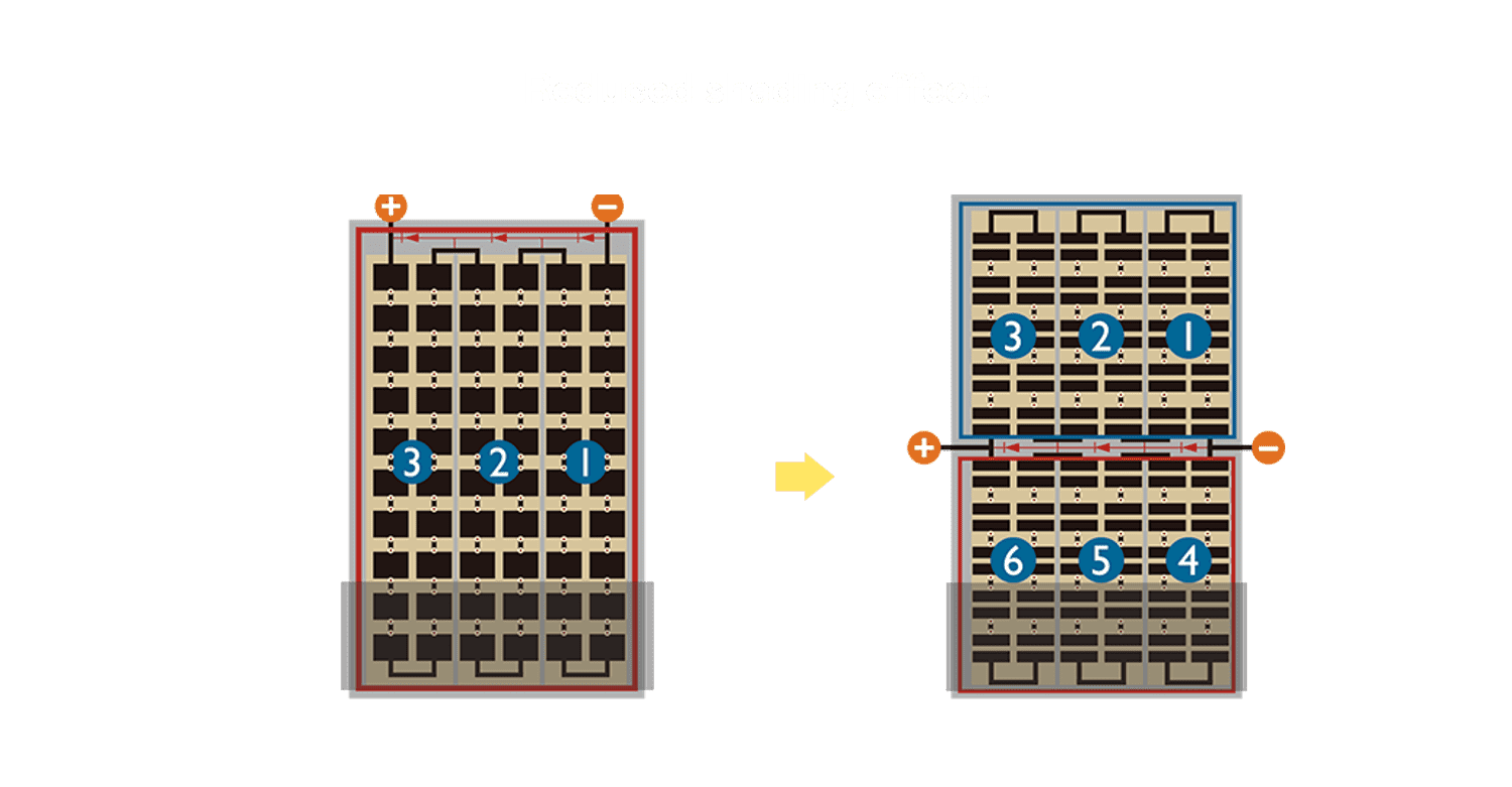 - 结合半切电池,,,降低遮阴影响、、提升模组抗隐裂能力、、、并减少电阻损耗,,,进一步提升模组发电效能。。
