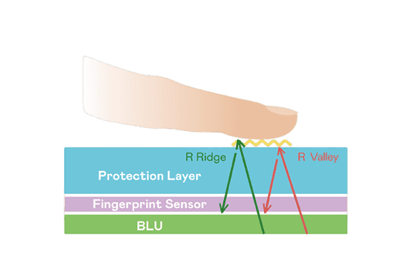TFT 指纹扫描感测技术利用薄膜电晶体 (TFT) 当作光感测元件,,,藉由非晶硅 (a-Si) 与低温多晶硅(LTPS)既有光电转换特性对不同波段光源进行吸收,,使感测 IC 读取阵列感测元件的光漏电差异,,,,转换成数位灰阶影像。。。